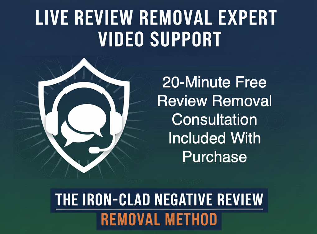 You get the full "Iron-Clad Negative Review Removal Method" along with the 3 additional free bonuses and a free, live 20 minute negative review removal consult call with one of our review removal experts.